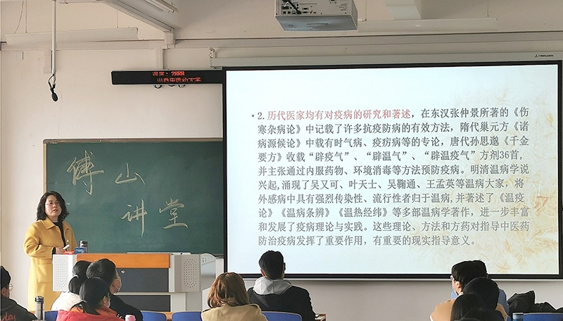 何丽清作了题为“中医药防治新冠及清肺解毒汤经典解析”的讲座。她通过介绍中医论治疫病的优势特色、从经典理论角度阐释解析清肺解毒汤,使同学们感受到经方的魅力,更加深入理解了中医整体观,提高了中医经典思维能力。