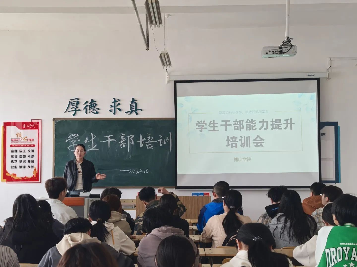4月15日,首期培训开讲。学院分团委副书记吕文雁以“班团干部的职责任务与价值引领”为主题,展开深入浅出的讲解。她运用丰富的案例与详实的分析,深刻剖析了学生干部在校园生活与班级建设中的关键角色定位。着重强调班团骨干不仅要将服务意识深植于心,更要时刻彰显先锋模范担当精神,尤其在学风建设的持续推进、各类活动的高效组织等方面,切实发挥好不可或缺的纽带桥梁作用。她进一步指出,班团干部需精准做好 “上传下达” 工作,积极主动地搭建起师生之间顺畅沟通的稳固桥梁,确保信息传递及时、准确,为营造良好的教学与学习氛围贡献力量。