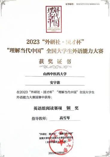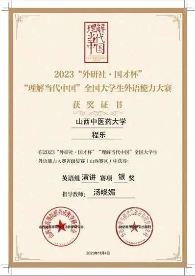 目前,已有三届学生转段到研究生阶段,转段率100%;2018级学生已于2024年首次参加医师资格考试,考试通过率91.53%。学院学生2023年获第八届全国学生“学宪法,讲宪法”活动“新华书店杯”山西赛区总决赛素养竞赛优秀奖、“外研社·国才杯”“理解当代中国”全国大学生外语能力大赛山西赛区(英语组)山西赛区决赛阅读赛金奖、演讲赛银奖;“外研社·国才杯”“理解当代中国”全国大学生外语能力大赛国赛阅读赛铜奖;2024年获首届晋中大学城高校学生创业活动获现代农业类组别创新奖(二等奖)、第九届全国学生“学宪法 讲宪法”活动“新华书店杯”山西赛区总决赛演讲比赛三等奖和素养竞赛三等奖、山西省科技活动周•山西(晋中)第一届大学生科技节创新设计比赛医养健康领域优秀奖、华北五省(市、自治区)大学生人文知识竞赛山西赛区决赛团队赛三等奖、“外研社·国才杯”“理解当代中国”全国大学生外语能力大赛英语组山西赛区决赛演讲赛铜奖;2025年获第十届全国悦读中医活动阅读推广人称号、“建行杯”中国国际大学生创新大赛山西赛区决赛金奖2项、“络学”杯中医药知识竞赛全国赛二等奖。