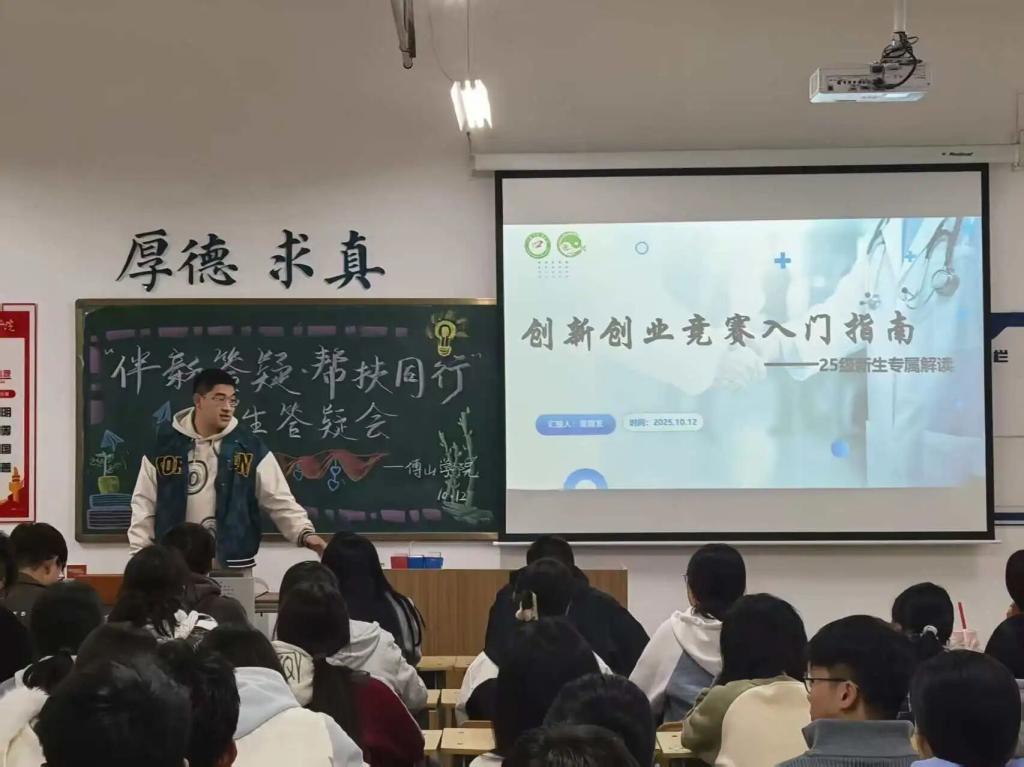 23级董顺发学长以亲身参赛经历为切入点,为新生系统讲解大学生创新创业大赛全流程与深层意义,他从“赛事选择与组队技巧”“项目选题与方案撰写”“路演准备与答辩技巧”三个维度展开,结合传统方剂改良、中医养生产品研发等中医药领域创新案例,解读如何将专业知识与创新创业思维结合,强调参赛能提升综合能力、拓宽专业视野、积累职业竞争力,鼓励新生尽早树立创新意识,积极参与科创赛事,为大学生活增添更多可能性。