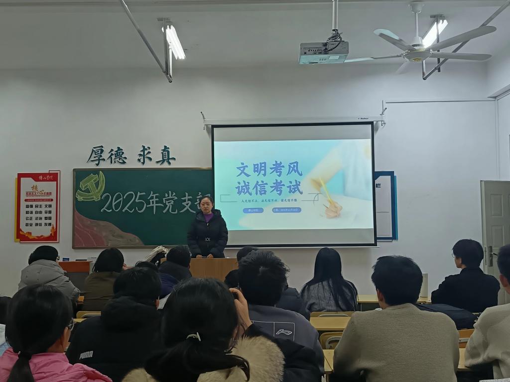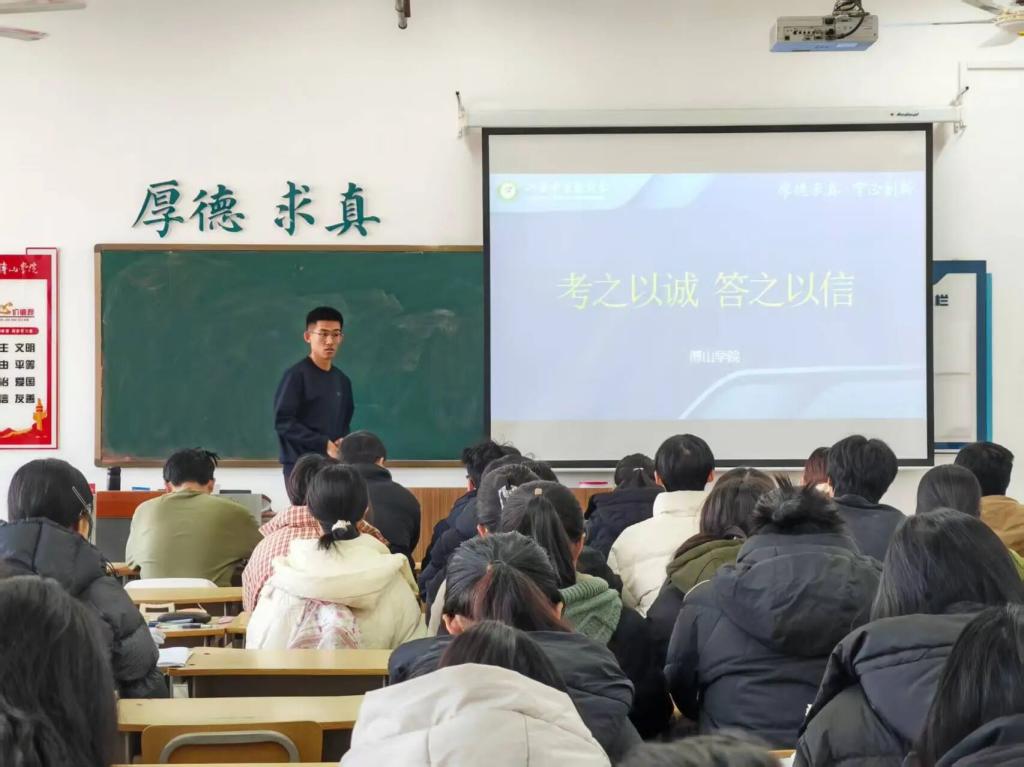 班会上,辅导员们结合高校考试违纪作弊典型案例,详细解读《国家教育考试违规处理办法》及学校考试管理规定,清晰阐明违纪作弊对学业、学籍及个人征信的严重影响,敲响诚信考试警钟。同时,围绕“诚信是立身之本、治学之基”展开宣讲,引导学生认识到诚信考试既是对自身学识的检验,也是对道德品质的锤炼。针对期末复习备考,辅导员们还分享了时间规划、重难点突破等科学复习方法,提醒学生调整心态、劳逸结合,鼓励大家以真实水平展现学习成果,用诚信品格书写青春答卷。